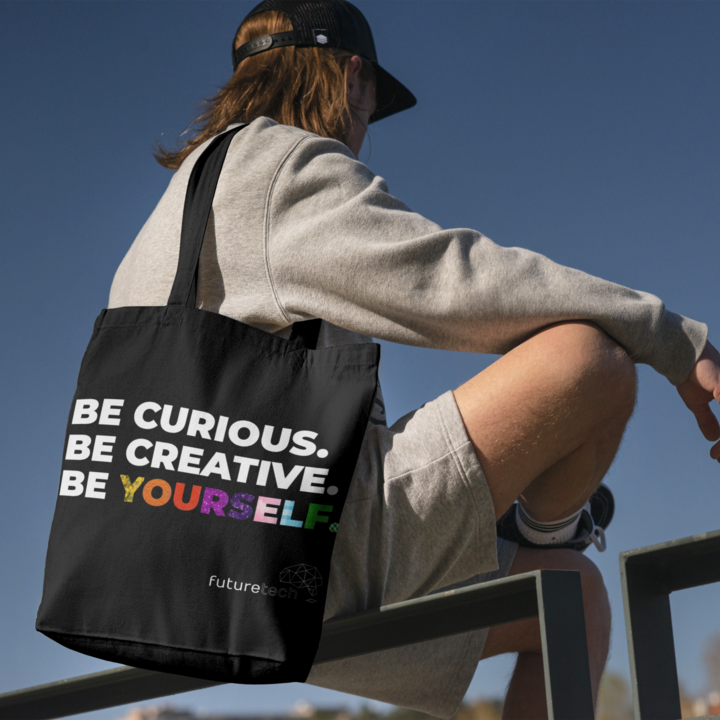 Carry your support wherever you go with our 'Be Curious, Be Creative, Be Yourself' FutureTech tote bag!